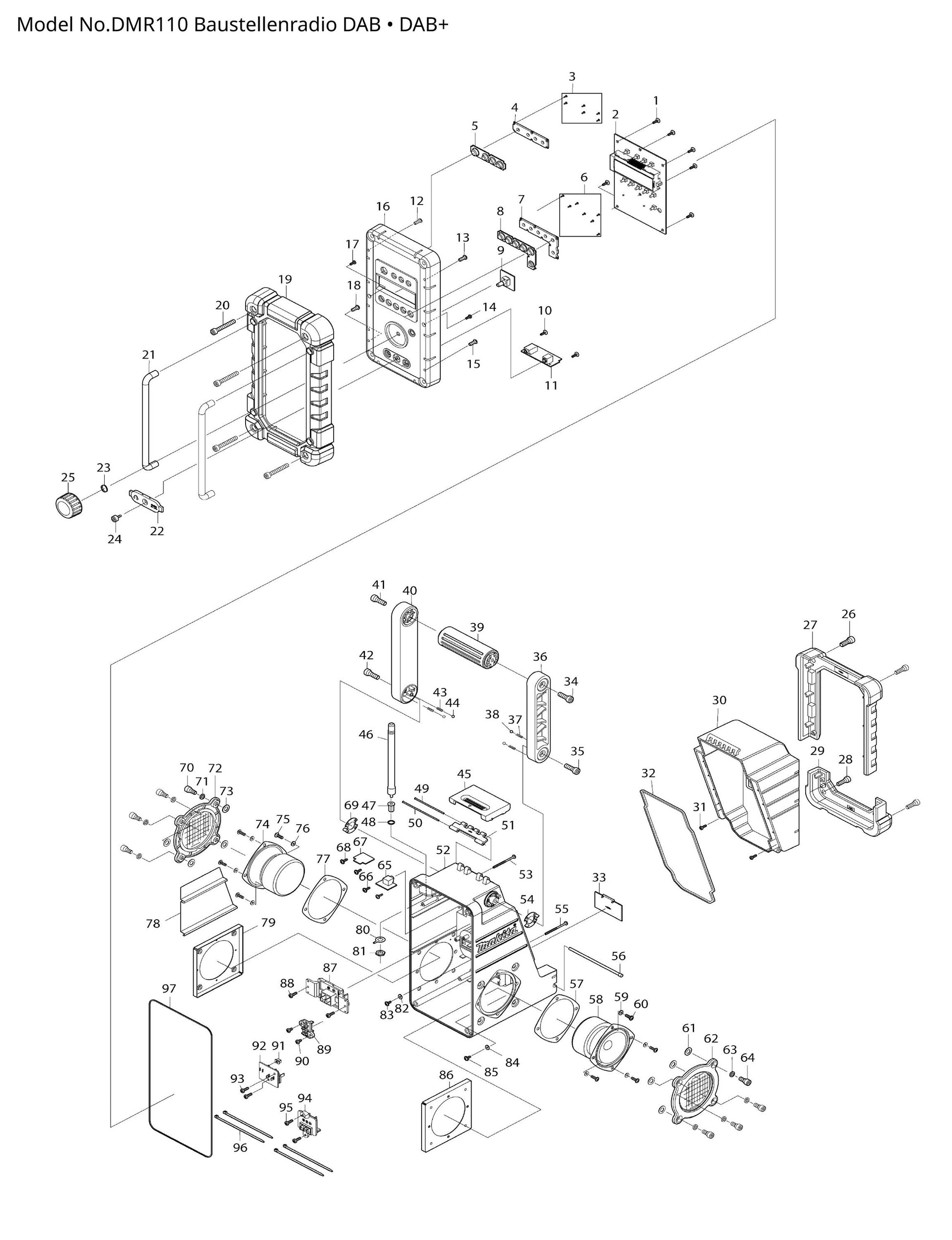 Hier findest du alle Ersatzteile für dein Akku-Baustellenradio DMR110 von Makita.
