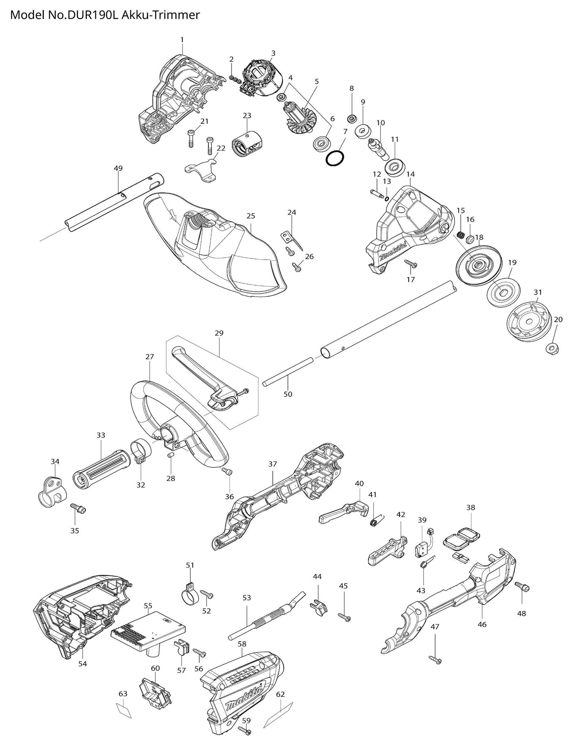 Hier findest du alle Ersatzteile für deinen Akku-Rasentrimmer DUR190L von Makita. Unsere Ersatzteile stammen alle vom Hersteller Makita.