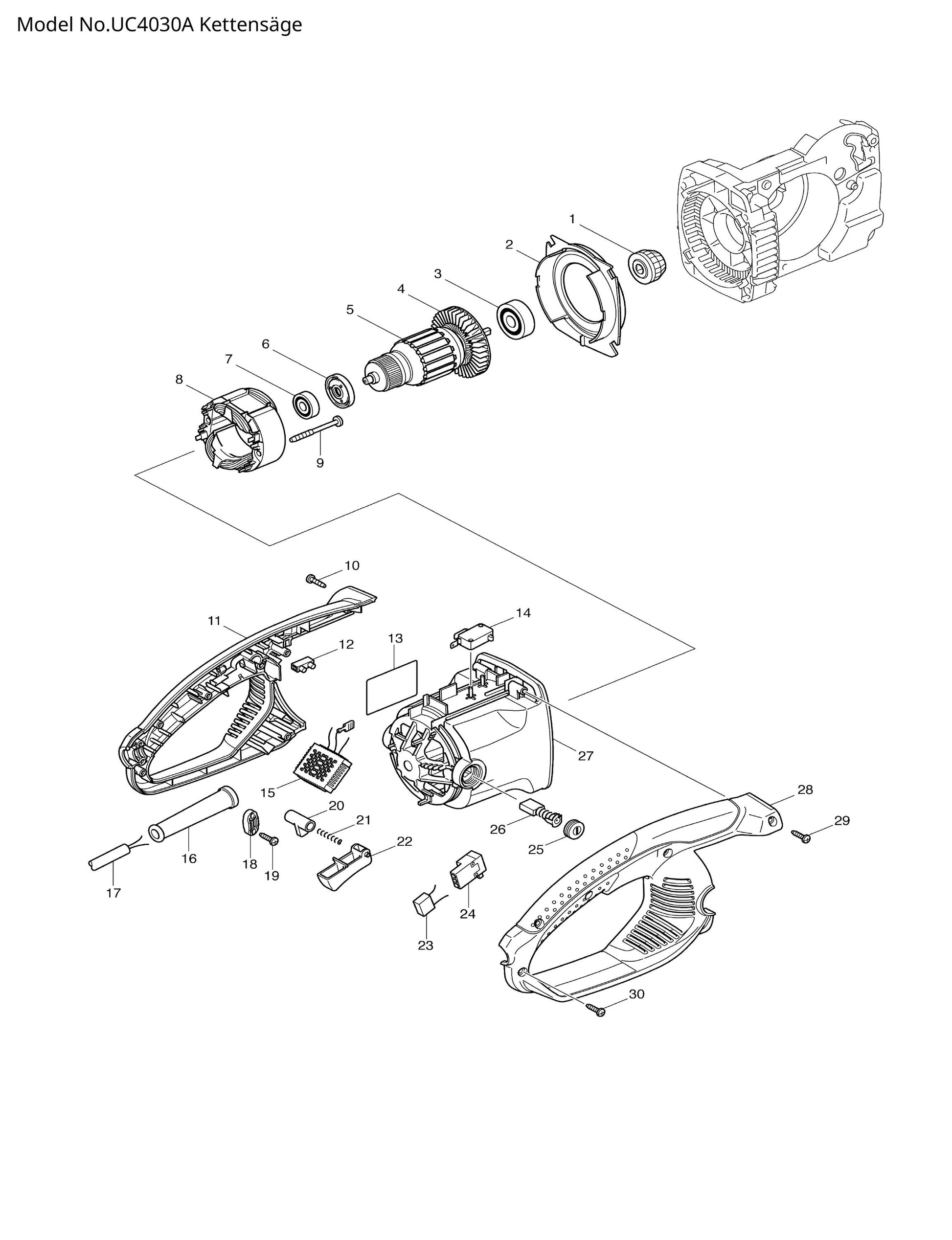 Hier findest du alle Ersatzteile für deine Elektro-Kettensäge UC4030A von Makita. Unsere Ersatzteile stammen alle vom Hersteller Makita.